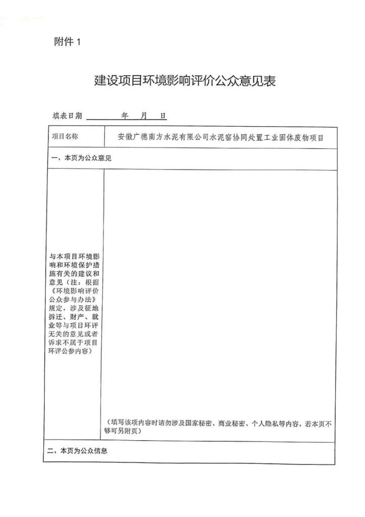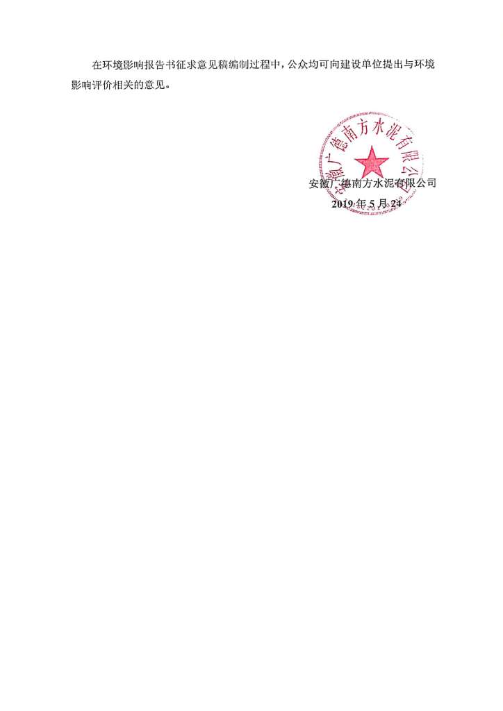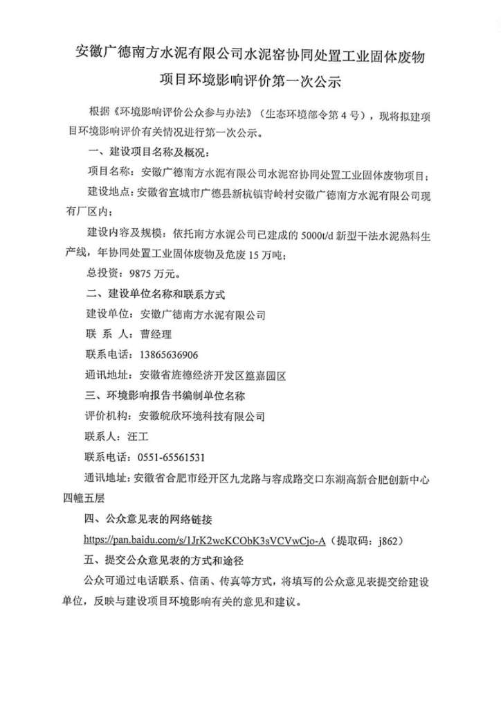 安徽广德南方水泥有限公司窑协同处置工业固体废物项目环境影响评价第一次公示